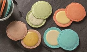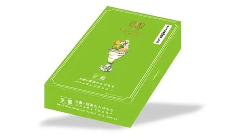 京都で愛され続けてきた「からふね屋珈琲店」のこだわりパフェを再現したサンドクッキーは、わらび粉を使用したクッキー生地でほのかに黒蜜が香ります。まさに食べるとパフェのような味わいです。
