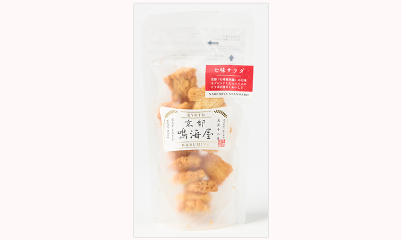 サクサク香ばしく焼き上げられたあられに、京都「七味家本舗」の七味唐辛子をブレンドしたオリジナルスパイスを振りかけ、ピリ辛と旨味が絶妙なバランスで、ビールがすすむ美味しさです。