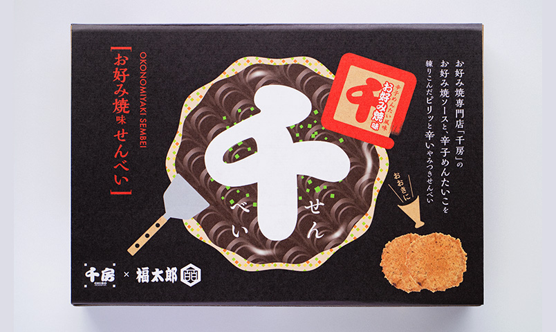 お好み焼きの名店「千房」と福岡の銘菓“めんべい”でおなじみの「福太郎」がコラボしたお好み焼味を再現したせんべいです。明太子と唐辛子でピリッとアクセントを加え飽きのこない味に仕上げています。