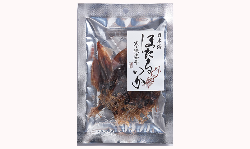 日本海で漁獲された旬のほたるいかを秘伝の調味液に漬け込み、独自の寒風製法で干しあげた「極旨珍味」です。そのままでも美味しくお召し上がりいただけますが、ご自宅では炙って食べるのもおすすめです。