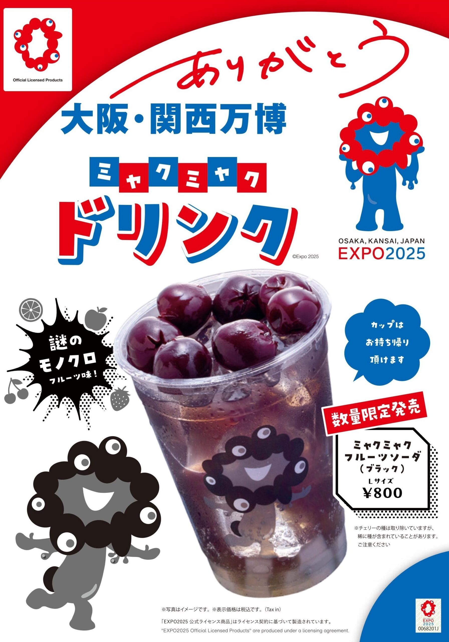 「ミャクミャクドリンク」好評につき、新フレーバー(黒ミャクミャク)が登場! 2025.12.19 DELI CAFE お知らせ からふね屋 お知らせ 今夏、好評いただいた「ミャクミャクドリンク」を、このたび『黒ミャクミャクドリンク』として販売いたします。(数量限定のため早期に販売を終了させていただく場合がございます) ミャクミャクフルーツソーダ(ブラック)Lサイズ 800円 カップはお持ち帰りいただけます。 ※税込価格 ※取扱店舗:デリカフェ・キッチン大阪店、エキスプレス大阪店、からふね屋珈琲エキマルシェ新大阪ソトエ店、からふね屋CAFE大阪店