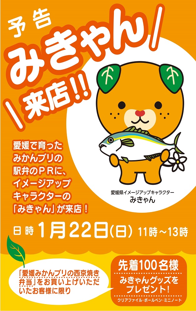 旅弁当駅弁にぎわいに「みきゃん」が来店します! 2017.01.17 旅弁当 旅弁当駅弁にぎわい 1/22(日)愛媛県イメージアップキャラクターみきゃんが来店します! 詳しい内容はこちら 【予告】みきゃん来店!!