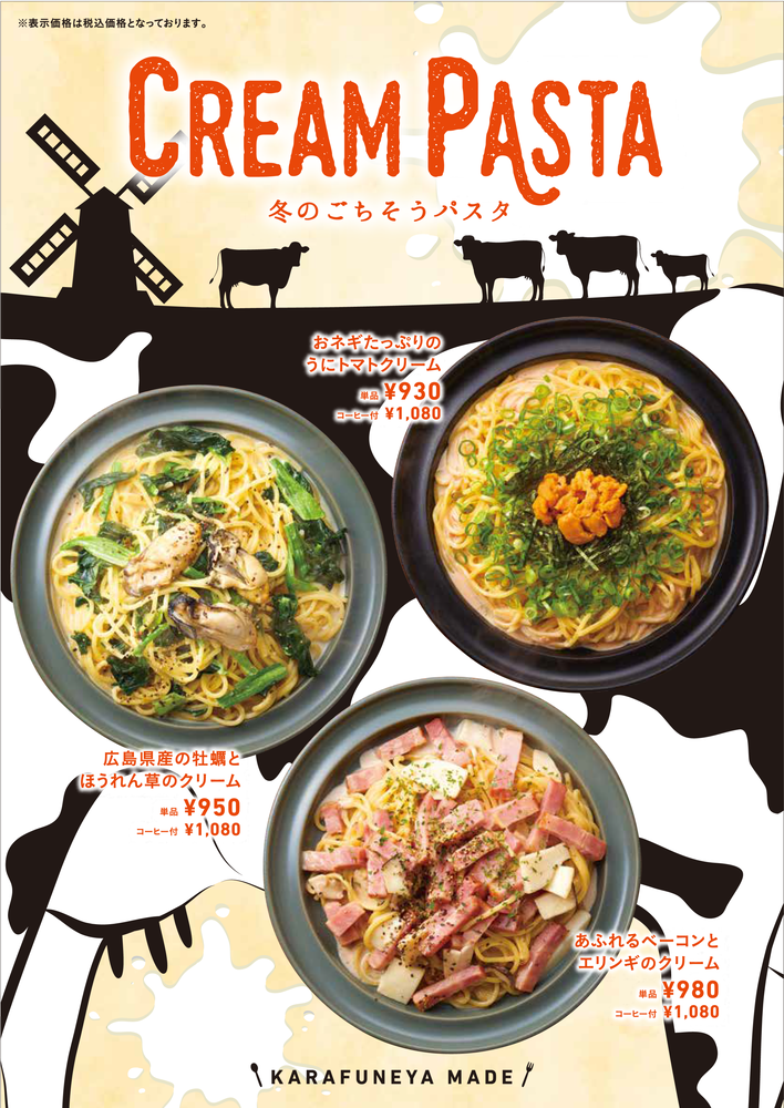 からふね屋珈琲 「冬のごちそうパスタ」のご案内 2018.12.27 お知らせ からふね屋 お知らせ からふね屋珈琲で「冬のごちそうパスタ」を期間限定で販売します。(~2/末予定) おネギたっぷりのうにトマトクリーム 900~930円 広島県産の牡蠣とほうれん草のクリーム 910~950円 あふれるベーコンとエリンギのクリーム 930~980円 ※税込価格 ※取扱店舗:からふね屋珈琲三条本店・熊野店・山科店・小倉店・竹田店・高槻店・箕面店・プレンティ店、からふね屋CAFEあべのキューズモール店・ビエラ高槻店・岸辺健都店 ※コーヒー付は全品1,080円 からふね屋珈琲(オフィシャルサイト)
