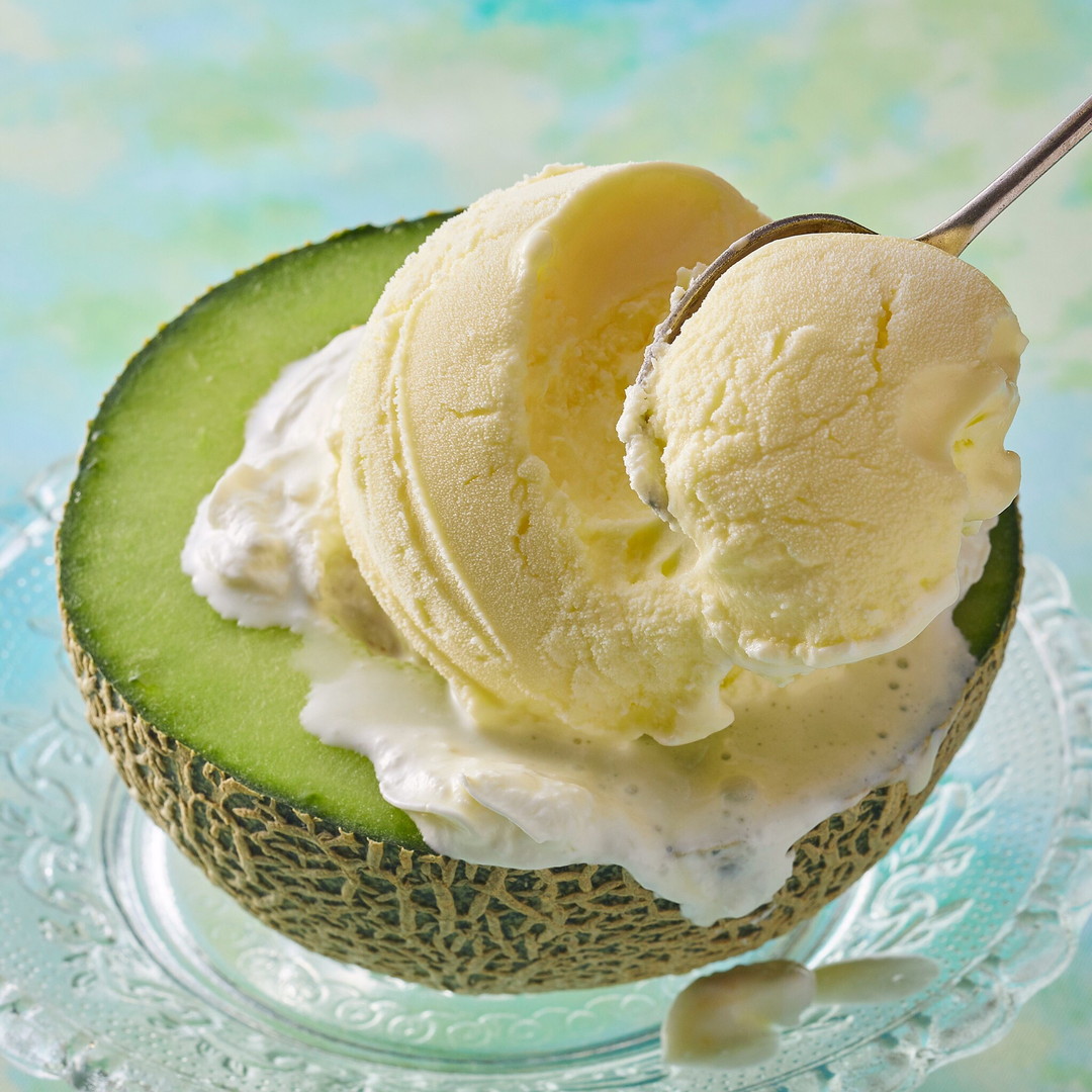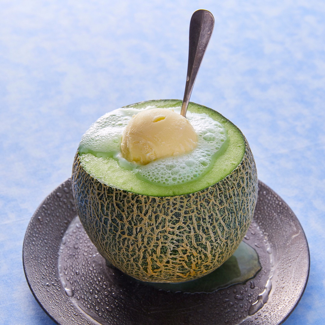 メロンをそのまんま使用したパフェ「メロンレーニア」と、本当の「メロンクリームソーダ」を販売します(~8/末予定)