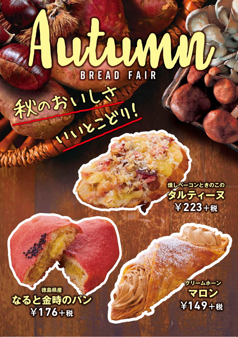 DELI CAFE 「秋のベーカリーフェア」のご案内 2019.10.10 DELI CAFE お知らせ お知らせ DELI CAFEで「秋のベーカリーフェア」を開催します。(~11/末予定) 燻しベーコンときのこのタルティーヌ 223円 徳島県産なると金時のパン 176円 クリームホーンマロン 149円 ※税抜価格 ※取扱店舗:デリカフェ三ノ宮・大阪mido・草津・石山・宝塚 デリカフェ(店舗情報)