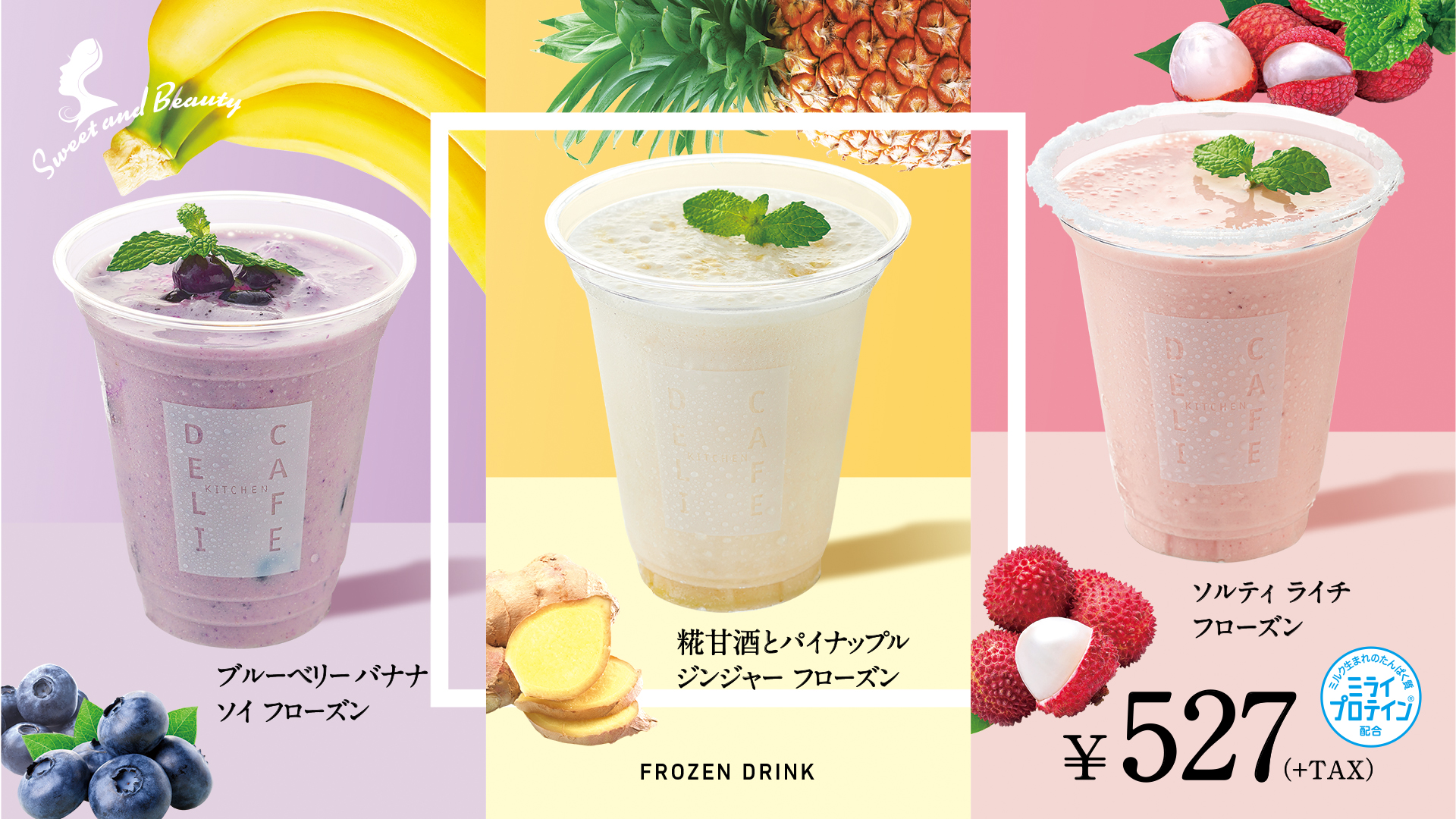 DELI CAFE 「夏ドリンク」のご案内 2020.07.22 DELI CAFE お知らせ お知らせ DELI CAFEで「夏ドリンク」を販売します。(~9/末予定) ブルーベリーバナナ ソイ フローズン 527円 糀甘酒とパイナップル ジンジャー フローズン 527円 ソルティライチ フローズン 527円 ※税抜価格 ※取扱店舗:デリカフェ大阪mido・North・大阪・三ノ宮・茨木・京都・エキスプレス大阪 デリカフェ(店舗情報)