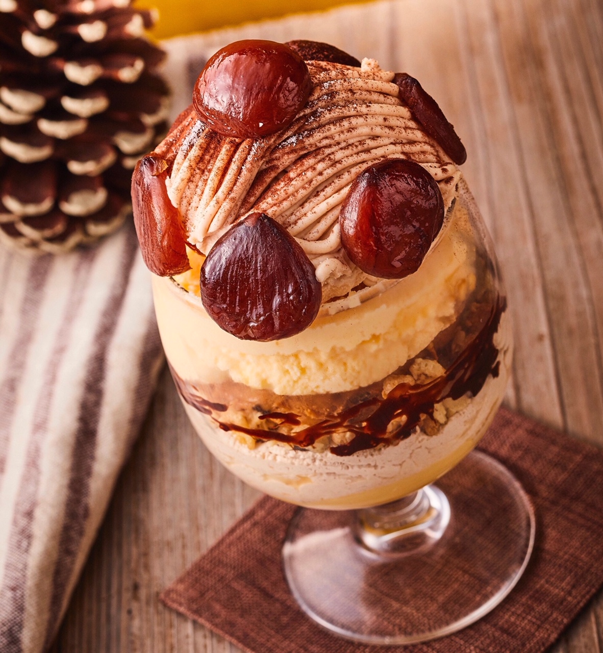 マロンペーストと口当たりの良い生クリームを使用し、視覚でも秋を楽しんでいただけるパフェです。