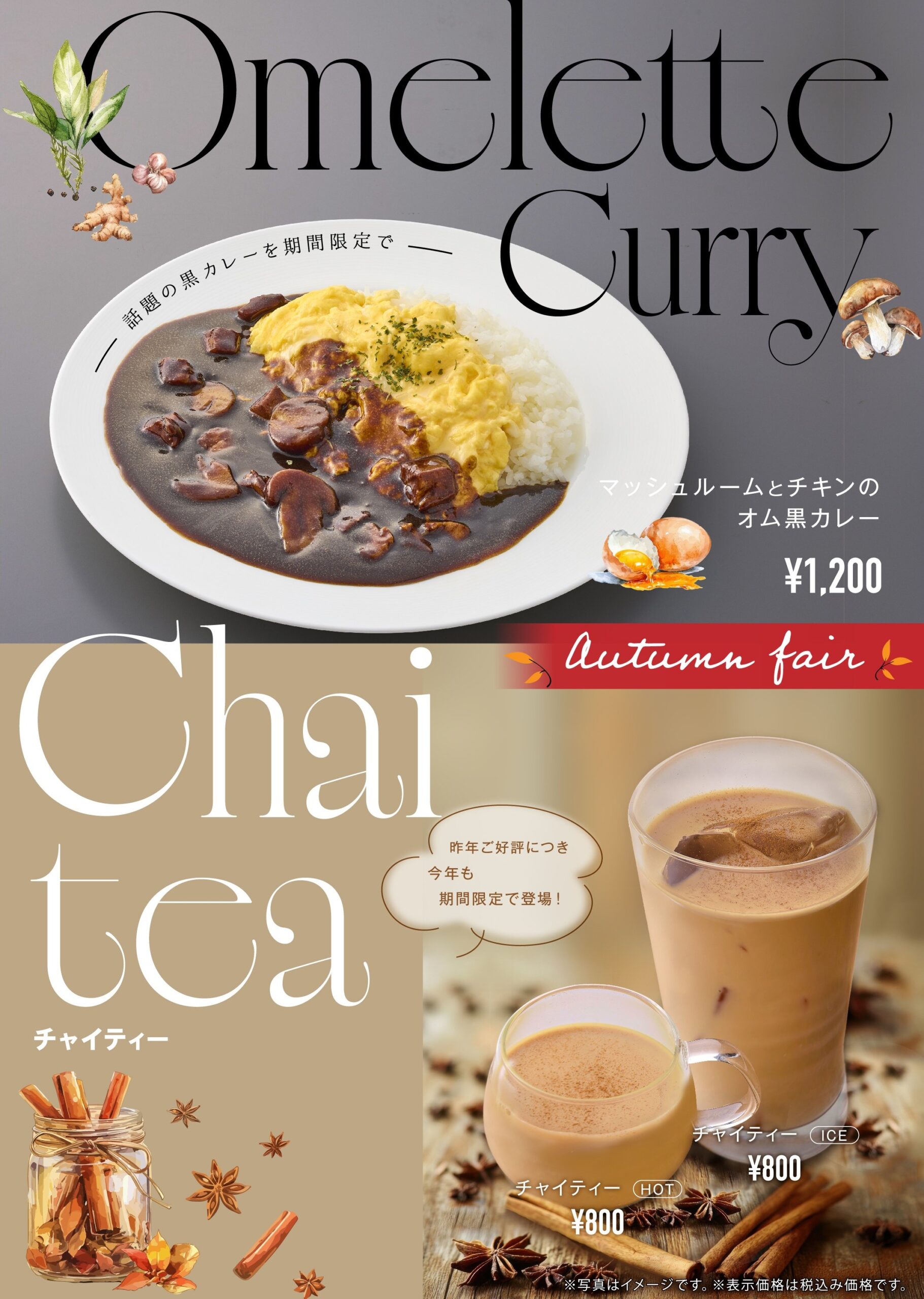Drip-X-Cafe、エスタシオンカフェ 2025秋の新商品(フード、ドリンク)のご案内 2025.10.30 Drip-X-Cafe お知らせ お知らせ Drip-X-Cafe、エスタシオンカフェで秋の新商品(フード、ドリンク)を期間限定で販売します。(~2025年12月中旬予定) マッシュルームとチキンのオム黒カレー 1,200円 チャイティー(ホット・アイス) 800円 ※税込価格 ※取扱店舗:Drip-X-Cafe新大阪、ヴィスキオ大阪、エスタシオンカフェ新神戸、タイム、京都、三ノ宮