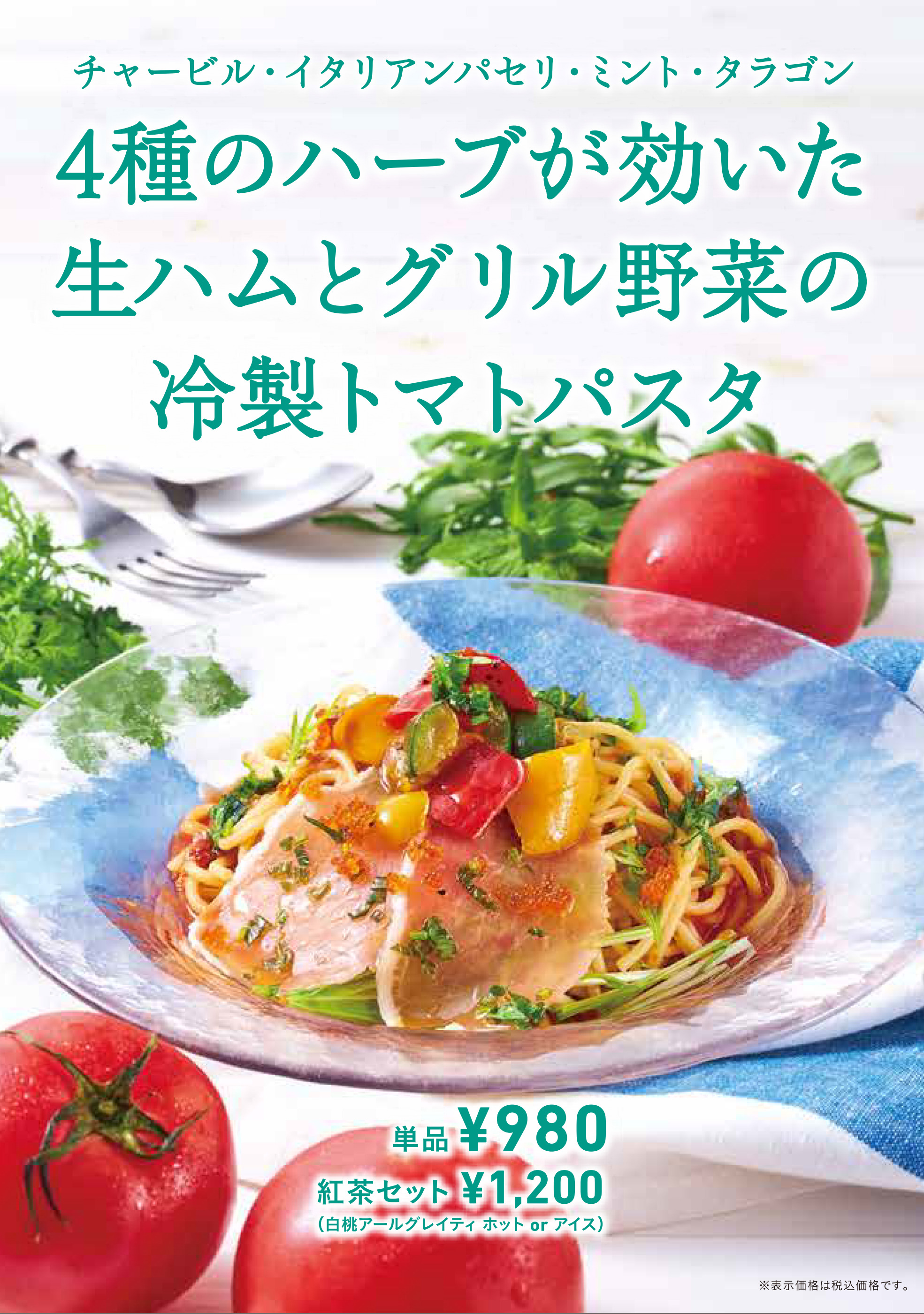 ※からふね屋珈琲熊野店・小倉店・プレンティ店・竹田店・高槻店・箕面店では、「生ハムとグリル野菜の冷製トマトバジルパスタ」を販売しています。