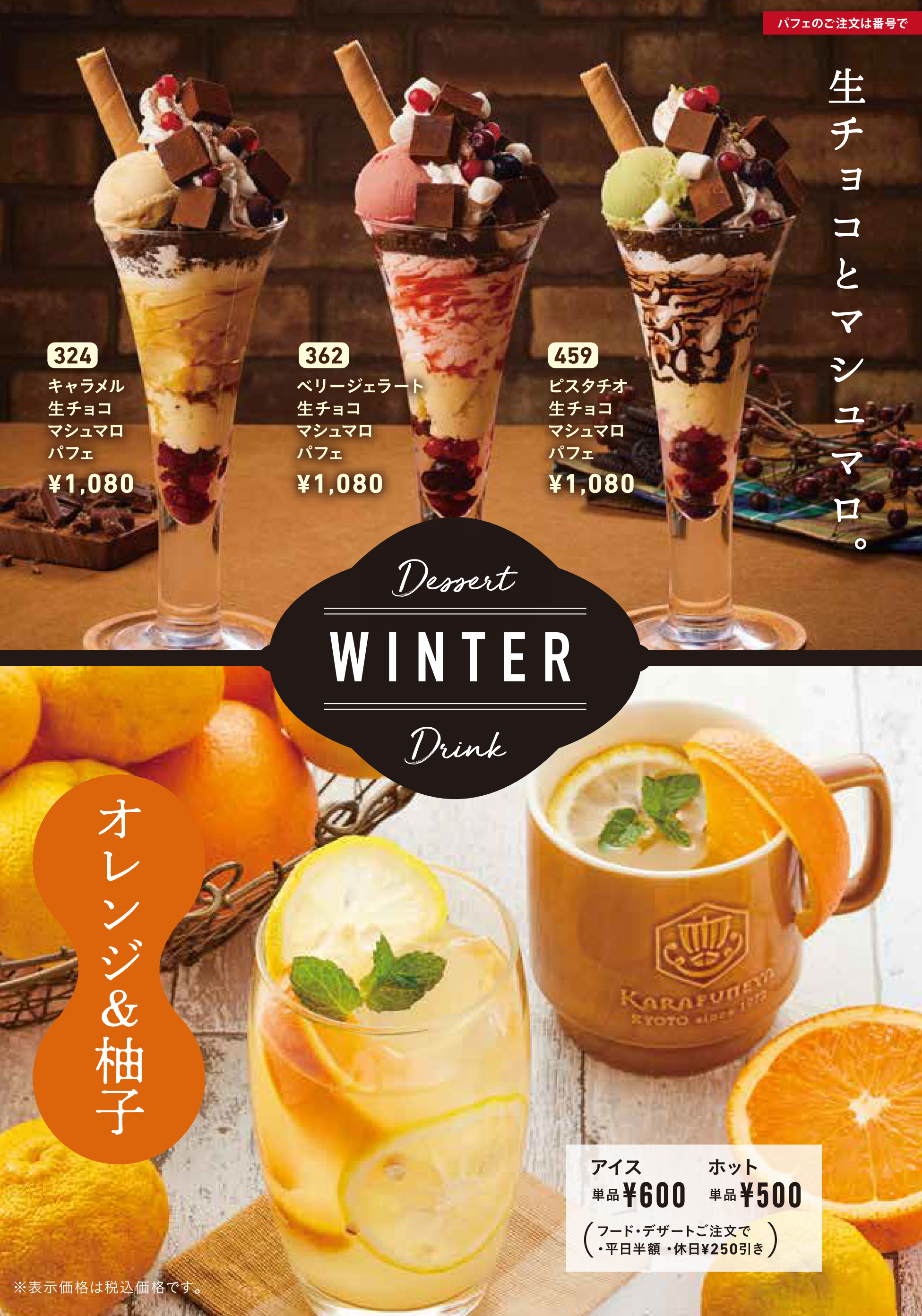 ※からふね屋珈琲小倉店、竹田店、箕面店、プレンティ店では「ホットオレンジ&ゆず(500円)」「アイスオレンジ&ゆず(600円)」「抹茶ぜんざい(780円)」を販売しています。