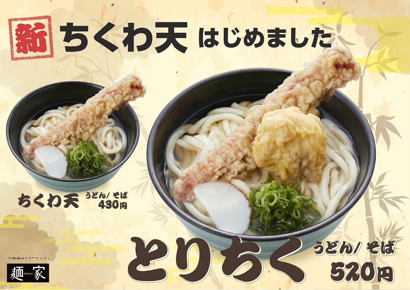 麺家 2024春の新商品(とりちく うどん/そば)のご案内 2024.04.17 お知らせ 麺家 お知らせ 麺家で春の新商品(とりちく うどん/そば)を期間限定で販売します。(~2024年6月中旬予定) とりちく うどん/そば 520円 ※税込価格 ※取扱店舗:麺家京橋東西線、京橋外回り、三ノ宮、京都上がも、京都下がも、明石、兵庫、鳳、山科、西九条、尼崎、新大阪上り、草津、天王寺、鶴橋、茨木、みちくさ、高槻 ※ちくわ天 うどん/そば(430~480円)も販売しています。※麺家全店舗(大阪みどうは磯部揚げ) 麺家(店舗情報)