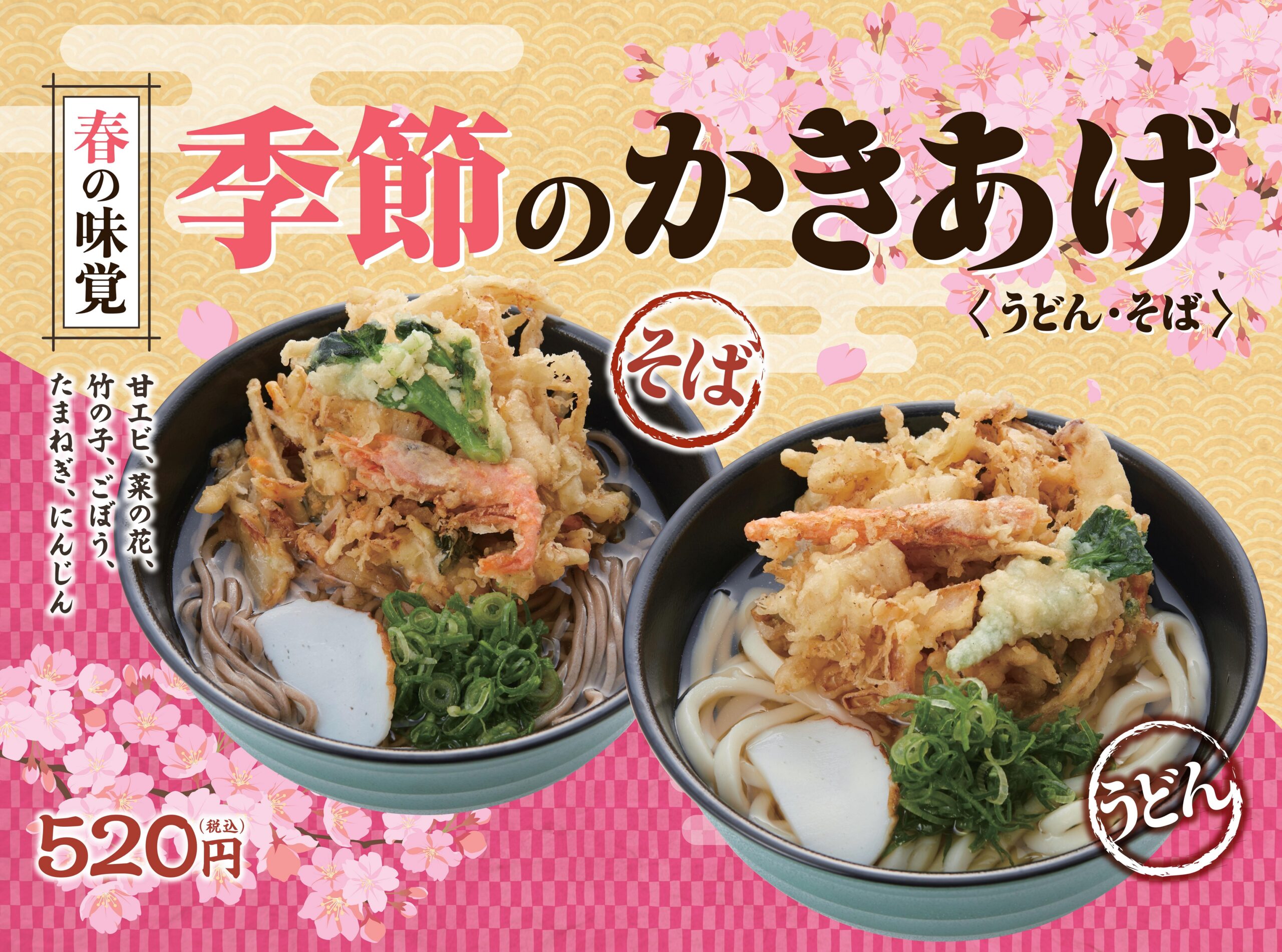 麺家春の新商品(季節のかきあげ うどん/そば)のご案内 2024.03.15 お知らせ 麺家 お知らせ 麺家で春の新商品(季節のかきあげ、ごぼう天うどん/そば)を期間限定で販売します。(2024年3月16日~2024年6月中旬予定) 春の味覚 季節のかきあげ うどん/そば 520~570円 ※税込価格 ※取扱店舗:麺家全店舗(京橋東西線、京橋外回り、三ノ宮、さがの、京都上がも、京都下がも、大阪みどう、明石、兵庫、鳳、山科、西九条、尼崎、新大阪上り、草津、天王寺、鶴橋、茨木、みちくさ、高槻) 麺家(店舗情報)