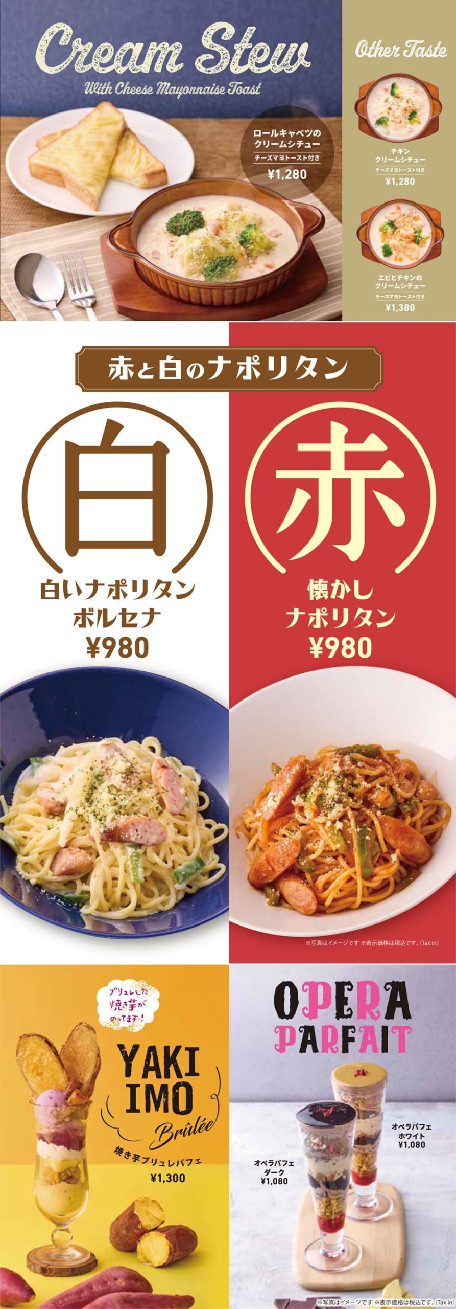 ※「白いナポリタン(ボルセナ)」は、からふね屋珈琲山科店、からふね屋CAFEビエラ高槻店、大阪店の取扱いはありません。