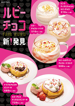DELI CAFE 「ルビーチョコフェア2020」のご案内 2020.02.13 DELI CAFE お知らせ お知らせ DELI CAFEで「ルビーチョコフェア2020」を開催します。(~3/末予定) ピンクティラミスwithルビーチョコ 510円 ルビーチョコレートラテ 510円 ルビー&ホワイトチョコレートミルク 500円 トリプルチョコのパンケーキ 680円 ルビーチョコティラミスパンケーキ 720円 ※税抜価格 ※取扱店舗:デリカフェ大阪mido・大阪・North・エキスプレス大阪・三ノ宮・茨木・京都 デリカフェ(店舗情報)