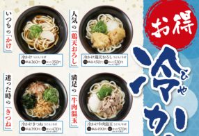 麺家で「冷かけうどん/そば」を販売します。(~9/末予定) ・冷かけ うどん/そば 260~320円 ・冷かけきつね うどん/そば 390~460円 ・冷かけ海苔 ...